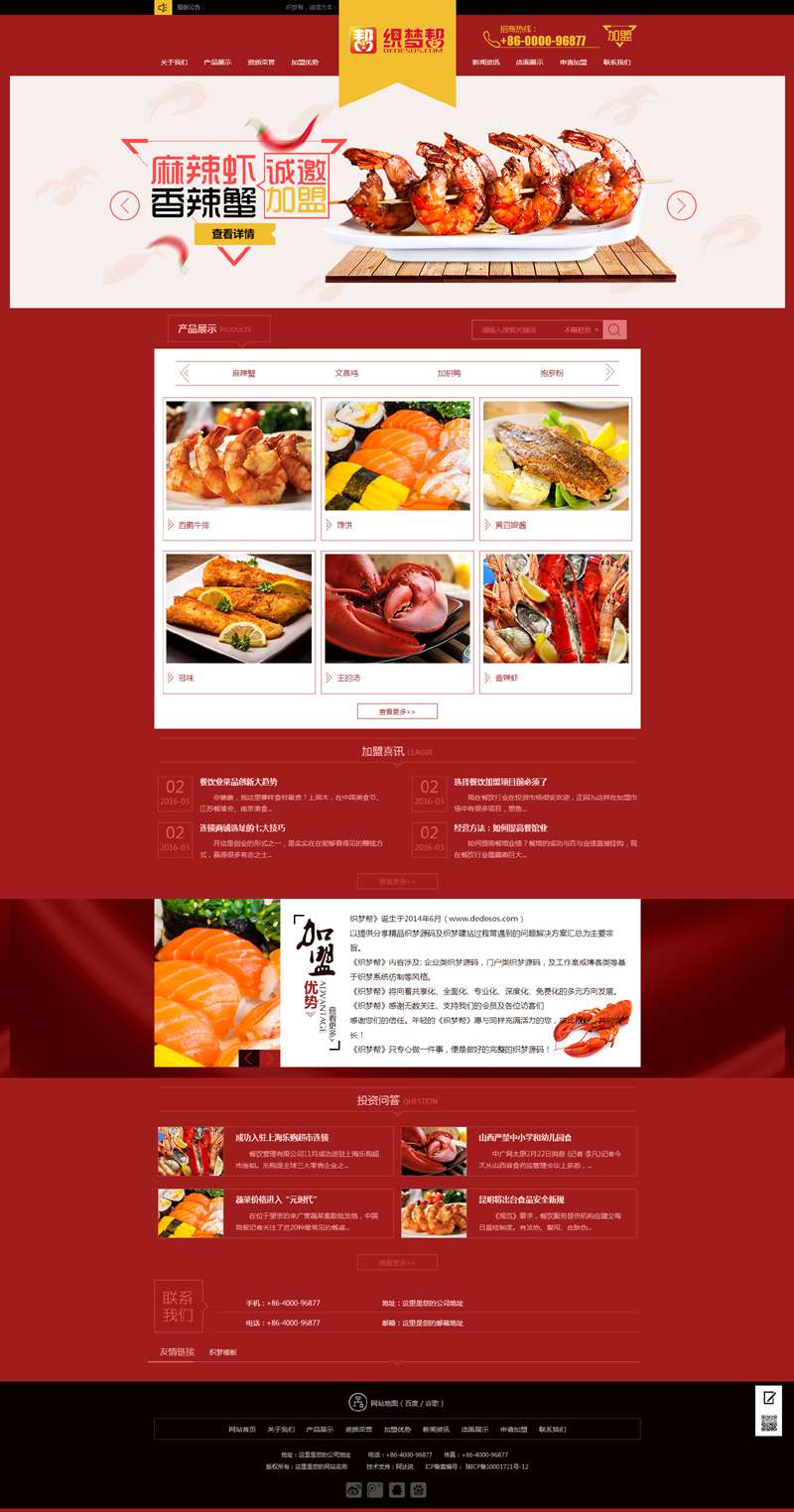 红色招商加盟食品类企业网站织梦模板,色彩搭配以红为主,体现出美食的多样化。设计简单、整洁,适合于美食行业、食品展示等。全部已数据调用,只需后台修改栏目名称即可。