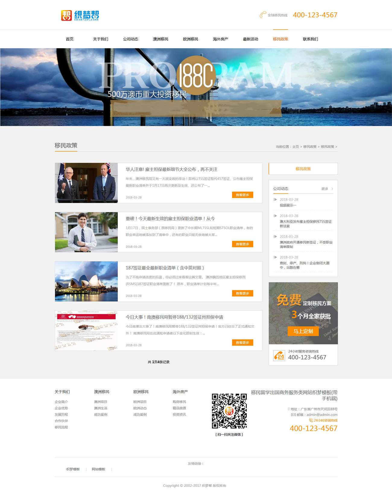 留学移民出国商务服务类织梦模板(带手机端),织梦CMS最新内核开发的模板,织梦最新内核开发的模板,该模板属于企业通用类、移民、出国、留学商务服务类企业都可使用,这款模板使用范围极广,不仅仅局限于一类型的企业,你只需要把图片和产品内容;换成你的,颜色都可以修改,改完让你耳目一新的感觉!原创设计、手工书写DIV+CSS,完美兼容IE7+、Firefox、Chrome、360浏览器等;主流浏览器;页面简洁简单,容易管理,DEDE内核都可以使用;附带测试数据!