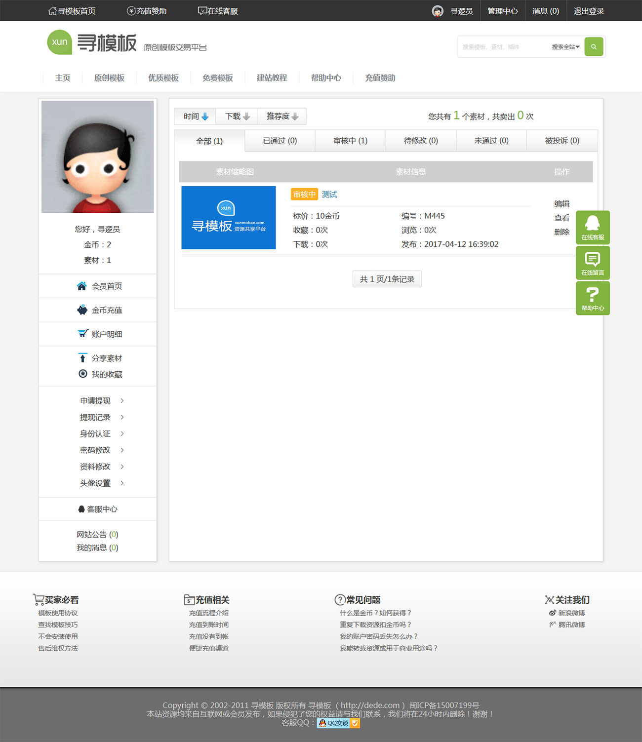 6.强大的会员功能:用户中心(登录、注册、找回密码、用户中心首页、金币充值、作品发布、作品管理、收藏夹、资料修改、身份认证、申请提现等)