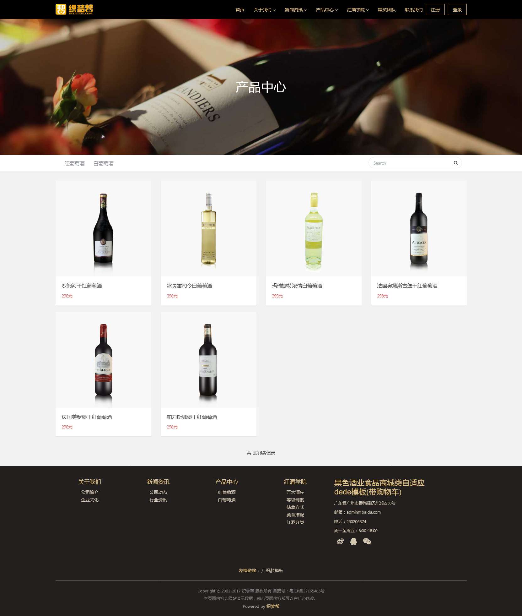 黑色酒业食品商城类自适应dede模板(带购物车),织梦最新内核开发的模板,该模板属于企业通用、HTML5响应式、酒业、食品、红酒、葡萄酒商城类企业使用,一款适用性很强的模板,基本可以适合各行业的企业网站!响应式自适应各种移动设备,同一个后台,数据即时同步,简单适用!