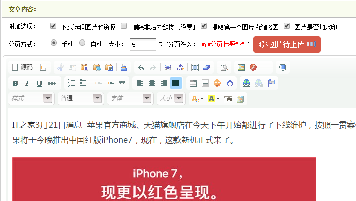 该插件安装后,会出现一键上传图片按钮,可以一键上传图片到七牛云、又拍云、阿里云OSS等,并可以实现一键自动排版。注:只支持文章模型。